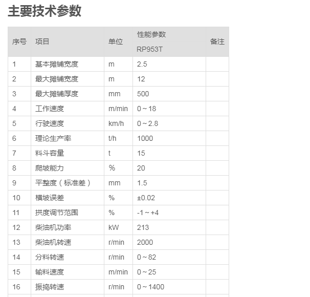 RP953T型攤鋪機是徐工大型攤鋪機中重要的機型,具有可靠的品質(zhì),超強的施工能力,優(yōu)異的工作性能和較高的性價比,是一種可廣泛應用于高速公路基層和各種等級公路面層材料攤鋪作業(yè)的施工設備,尤其適應于路基施工大厚度大寬度一次成型。該機采用全液壓驅(qū)動,微電腦控制,左右獨立驅(qū)動,超聲波料位傳感控制,雙振搗壓實等當今世界******技術(shù),配合獨特的結(jié)構(gòu)設計,使得該機具有超厚作業(yè)能力強,攤鋪穩(wěn)定性好,預壓密實度高,路面平整度好,操作簡單舒適,維修方便快捷等優(yōu)點,該機關鍵配套件采用進口元件,使得整機制造質(zhì)量和可靠性達到同類產(chǎn)品領先水平,是攤鋪基礎穩(wěn)定材料和lumina瀝青混凝土材料的理想設備。
